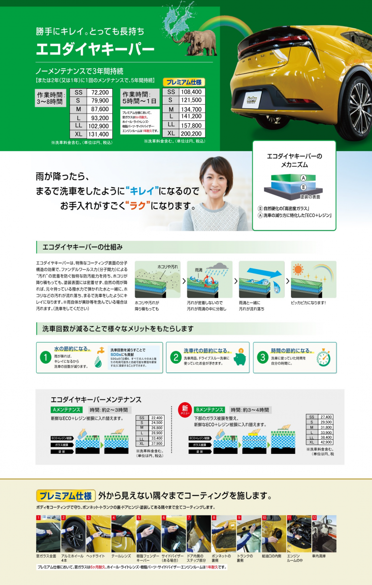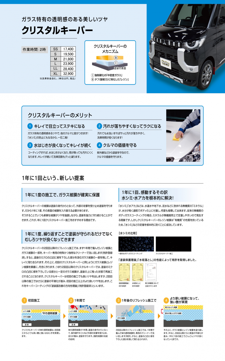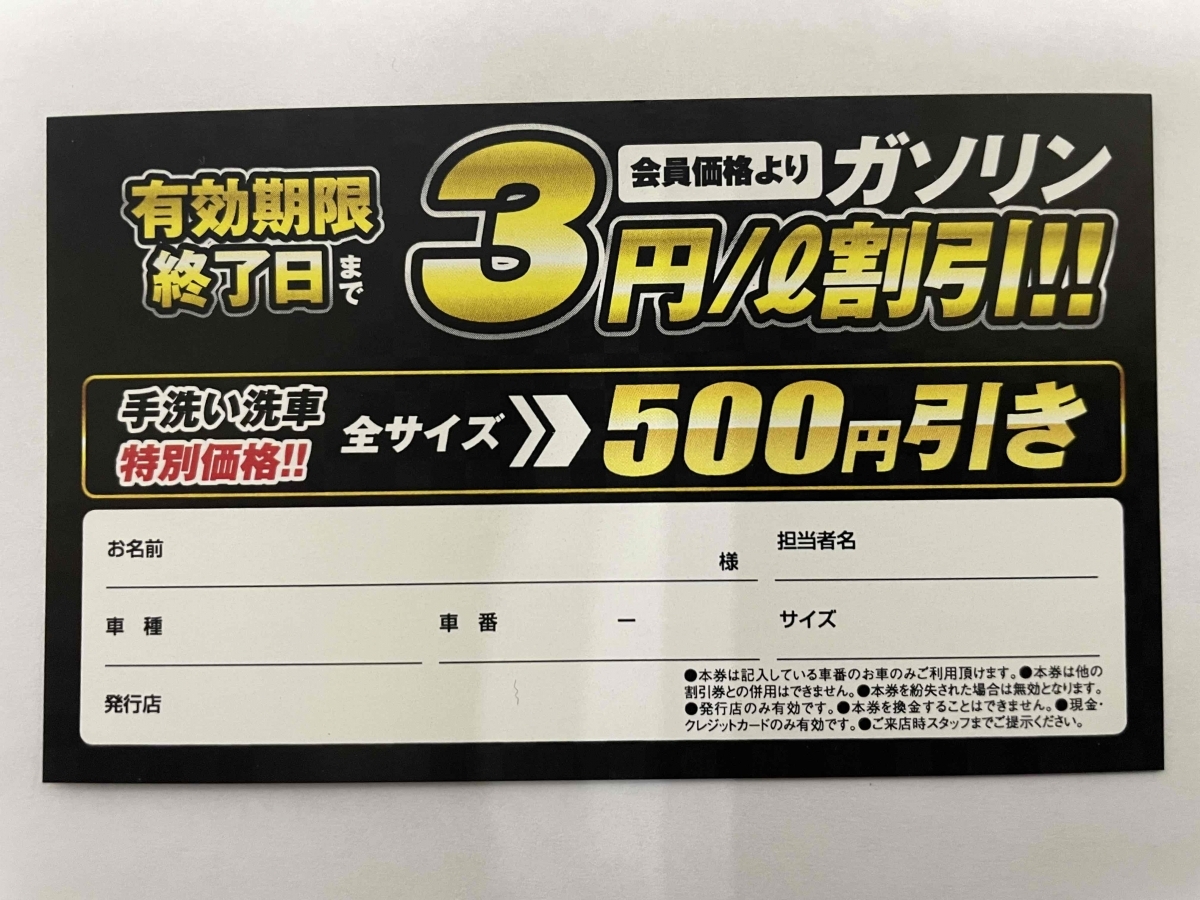 □■□当店オリジナルコーティング特典□■□ 当店ではコーティングを施工して頂いたお客様には純水手洗い洗車を会員価格でご案内してます。 さらにガソリン3円引きパスポート進呈。 ◇ピュアキーパー・・・3ヶ月有効 ◇クリスタルキーパー・・・1年間有効 ◇ダイヤモンドキーパー・・・1年間有効、メンテナンス施工でさらに1年間有効 ウサッピーカード併用でガソリン毎回5円引き!!! 当店はお忙しいお客様の為に代車の準備もしております。お時間を頂きしっかりと施工させていただきます。 台数に限りがありますのでご相談ください。