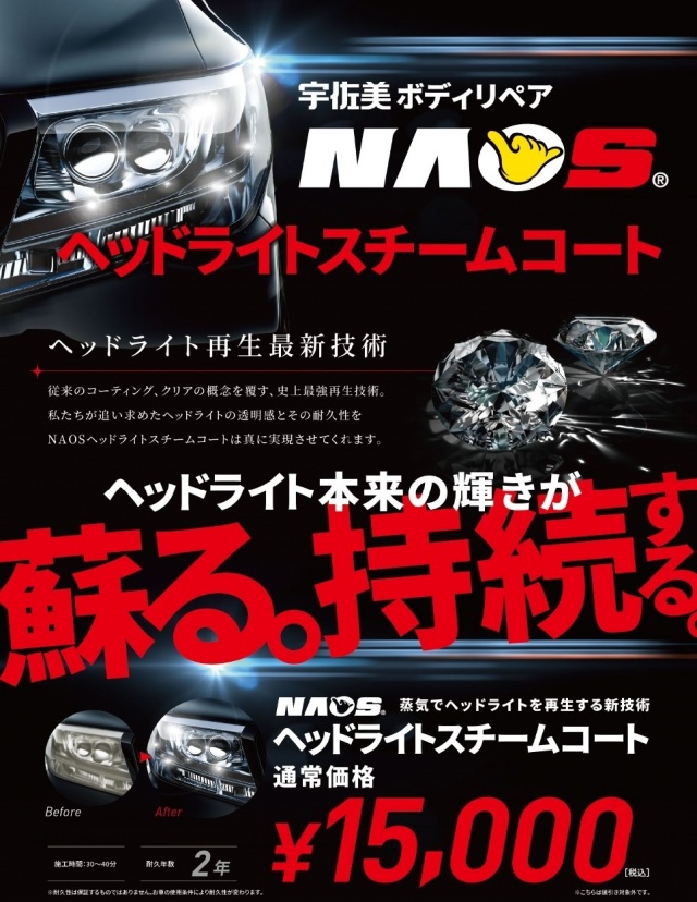 ヘッドライトスチームコート登場!!! 蒸気でヘッドライトを再生する新技術!!! めちゃめちゃ綺麗になります!!! 【耐久性2年】【施工時間30~40分】