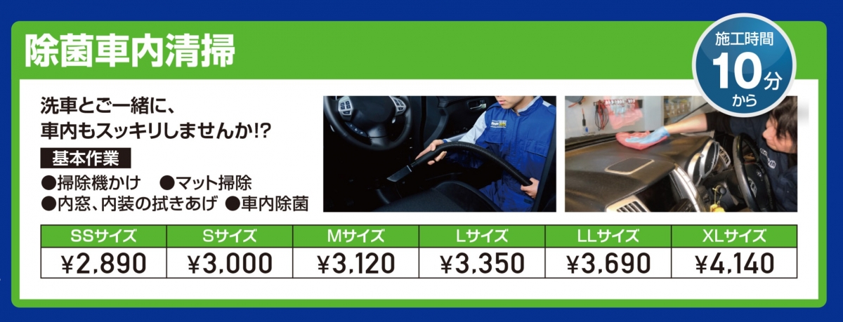 洗車・コーティングだけでなく、車内清掃メニューなど、