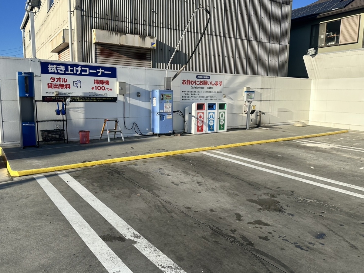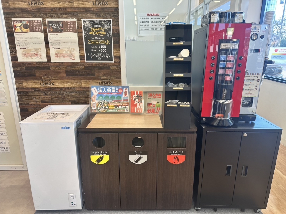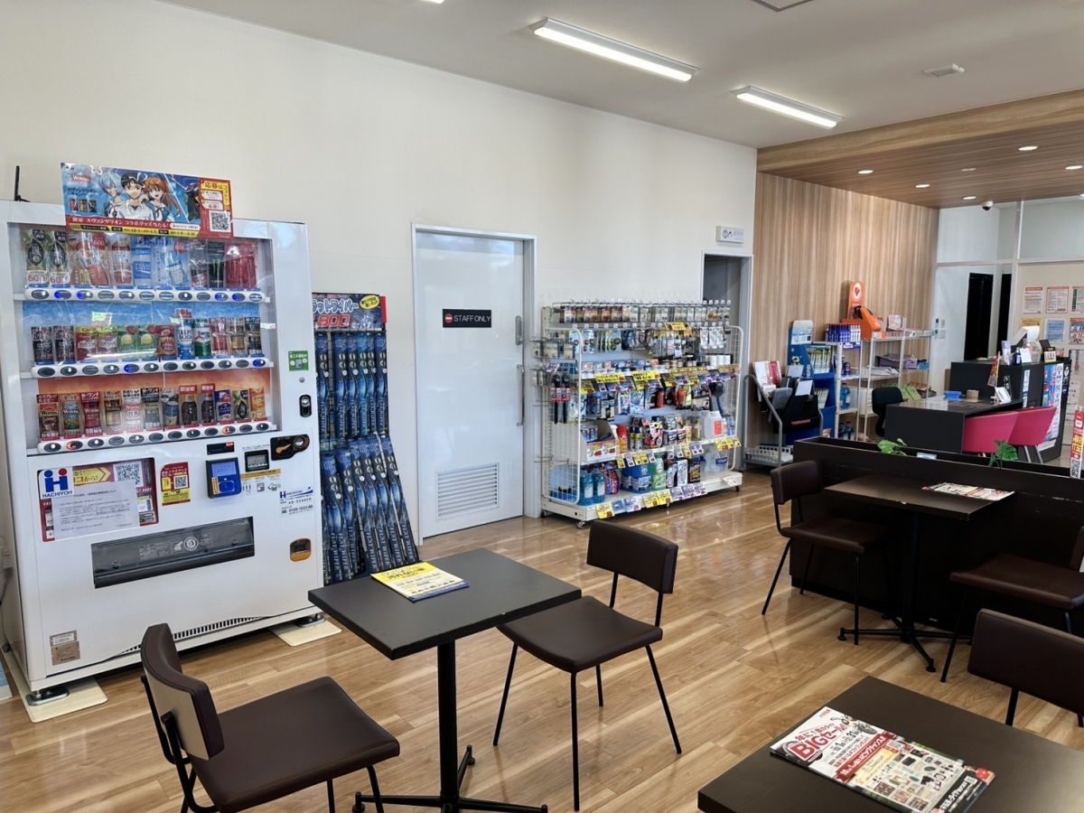 店内カー商品も設置!自動販売機のドリンクでごゆっくりお待ちください。
