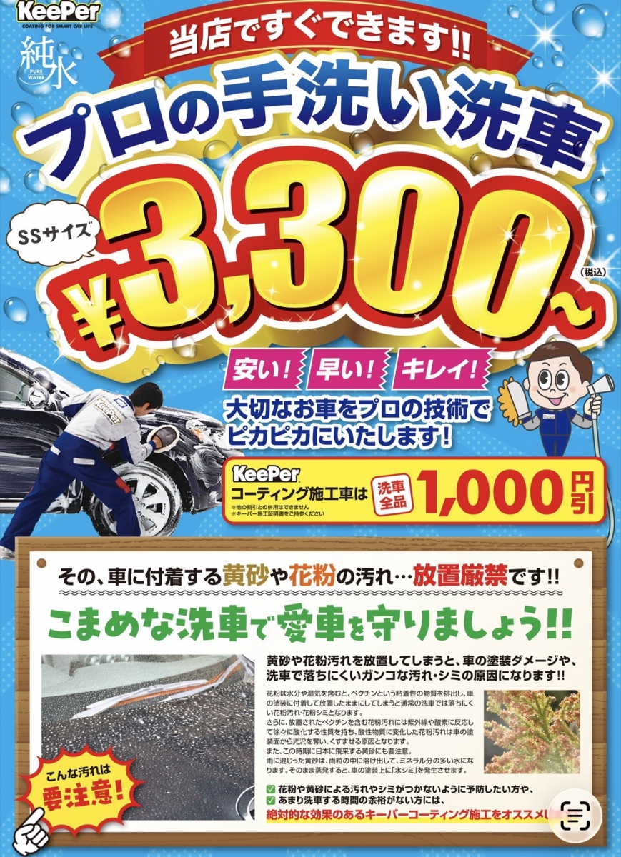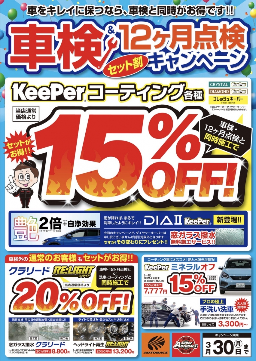 3月のキャンペーンです❗️ミネラルオフが15%引き❗️車検キャンペーンも継続中です🚗 ダイヤⅡキーパー取り扱い可能、施工車両にはフロントガラス撥水サービス‼️ 是非ご利用下さい❗️