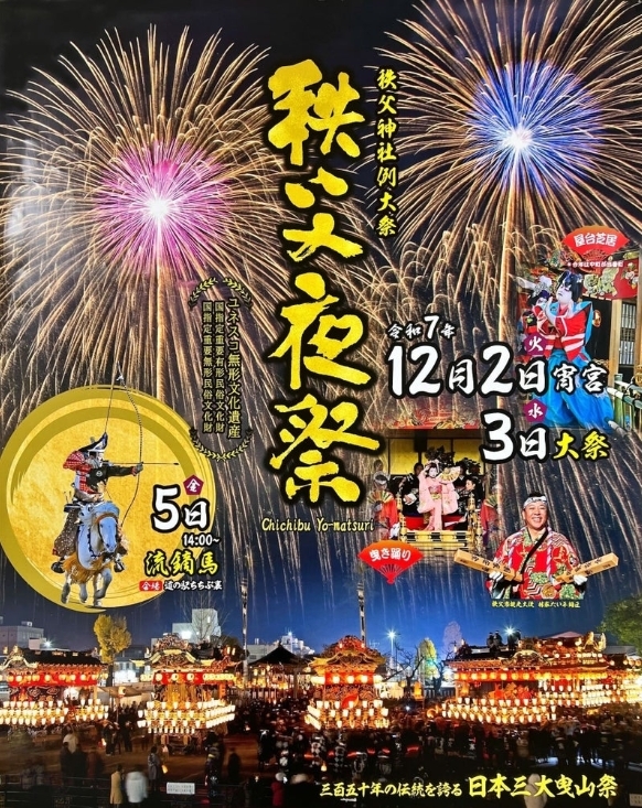 秩父夜祭が12/3(水)にあり、道路の渋滞などが予想されるためお祭り当日は臨時休業とさせていただきます。