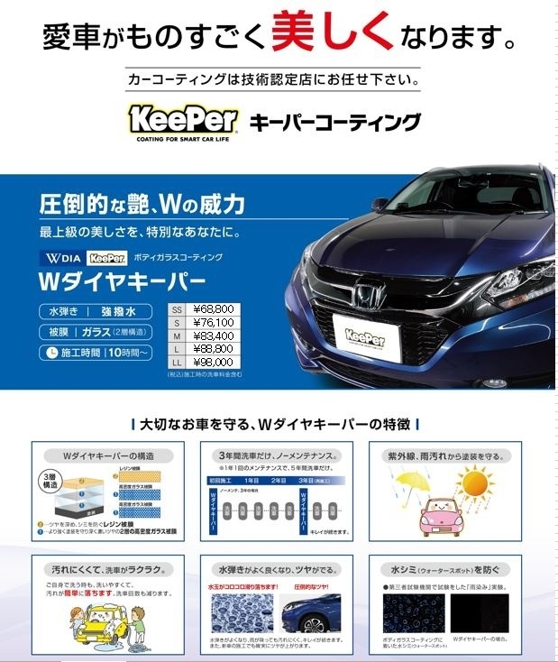 keeper独自の2層のコーティング被膜がさらに厚くなっており、最長5年耐久です。ノーメンテでも3年は愛車を守ります!!