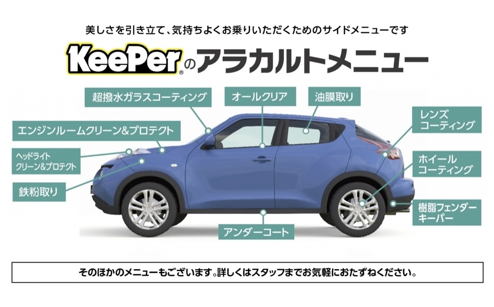 当店はコーティング技術認定店であり、さらにEXキーパーという最高級のメニューもお取り扱いしております。 ハイレベルなスタッフが揃っておりますので、安心してお車を預けていただけます。