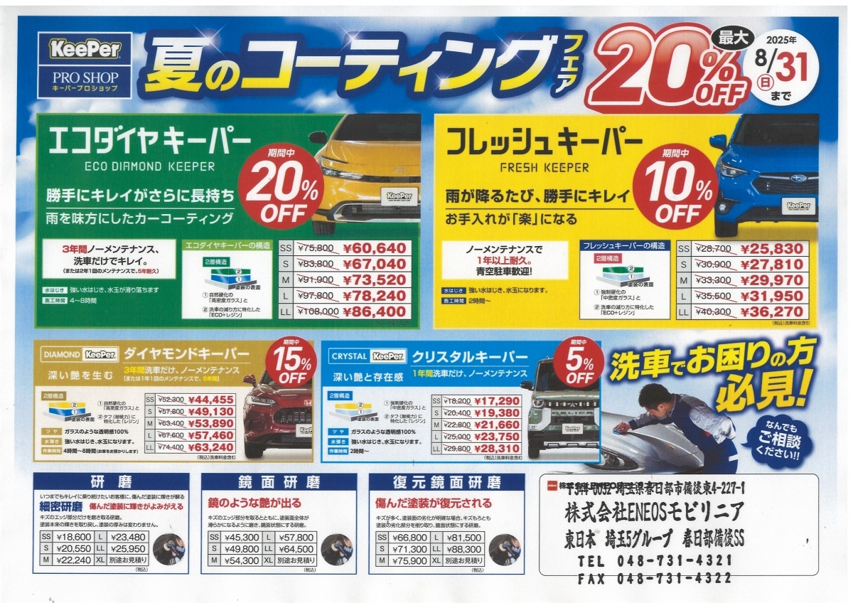 店頭でコチラのクーポンを提示していただくか、『WEBを見た』とお伝え頂くとコーティングがお得に施工できます!