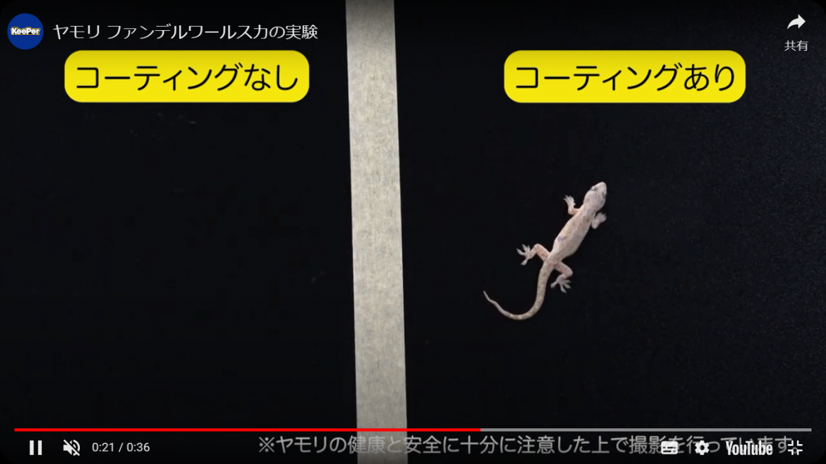 ヤモリは、家の外壁や天井にひっつき歩いていますが、それができるのはヤモリの手足にある独特の構造がファンデルワールス力による吸着力を強くしているからだそうです。フレッシュキーパーは、特殊な表面の分子構造の効果で「ファンデルワールス力」による汚れの密着を防ぐ特殊な防汚力を持っています。そんなヤモリが、フレッシュキーパーを施工したクルマの塗装表面を歩いたら…