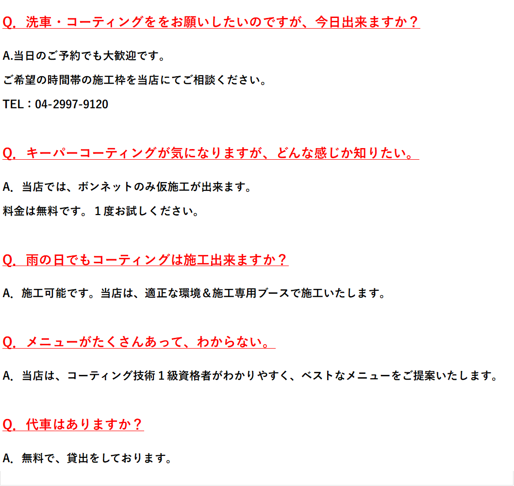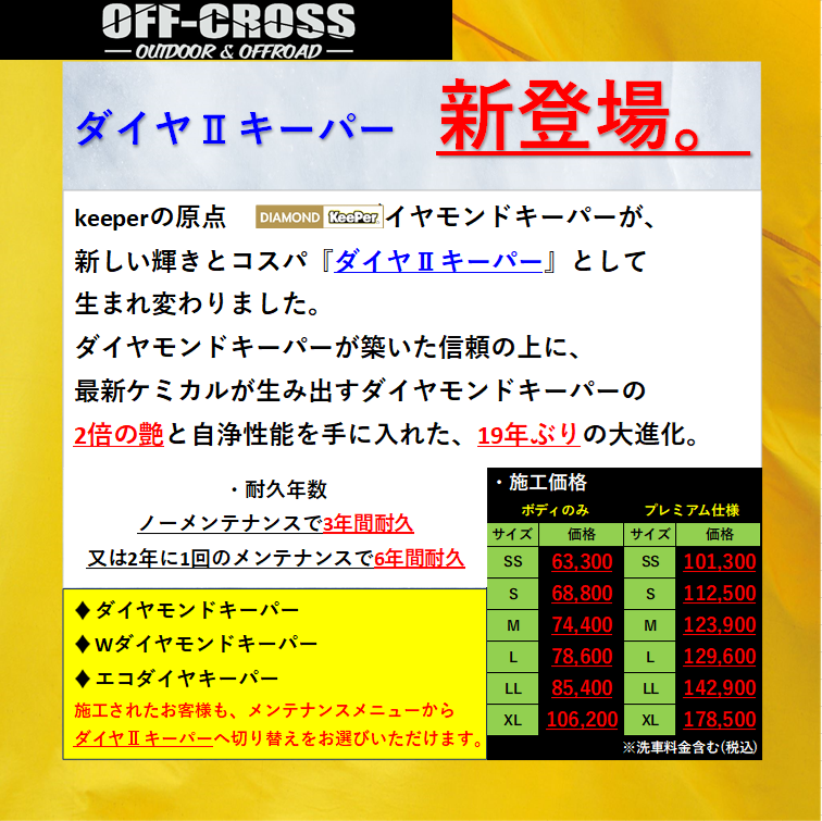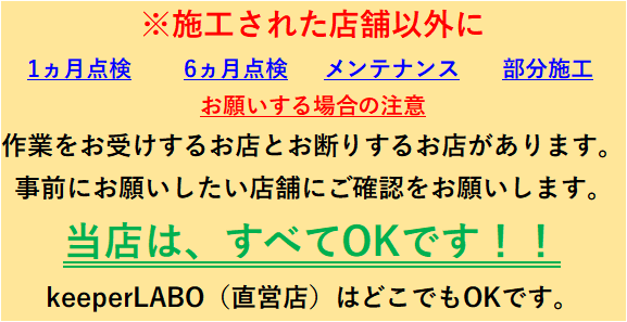 万が一、keeperコーティングをして、車を鈑金塗装することになってしまったら、塗装し直した部分は、コーティングがなくなってしまいます。修理した箇所の部分コーティングをさせていただきます。1パネルにつき、コーティング価格の15%です。どうかスタッフまでご相談ください。