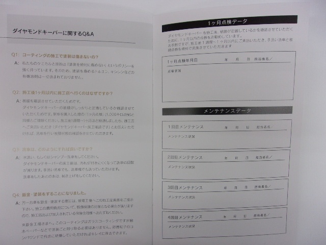 こちらには施工内容、コーティングの特性、普段のお手入れ、メンテナンスの履歴の記載を致します。