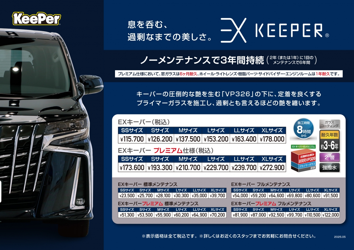 是非とも、一度クリスタルキーパーまたはダイヤモンドキーパーを施工する事により、多層の汚れ、コーティングの層をキレイさっぱり除去し、ガラス質の透明感のあるツヤ、汚れにくいレジン被膜を乗せたキーパーコーティングをオススメします。