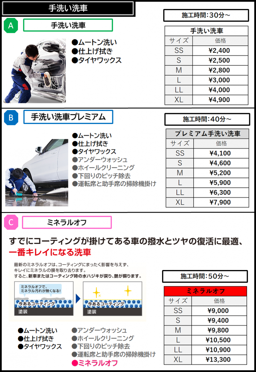 | 手洗い洗車・室内清掃・除菌抗菌