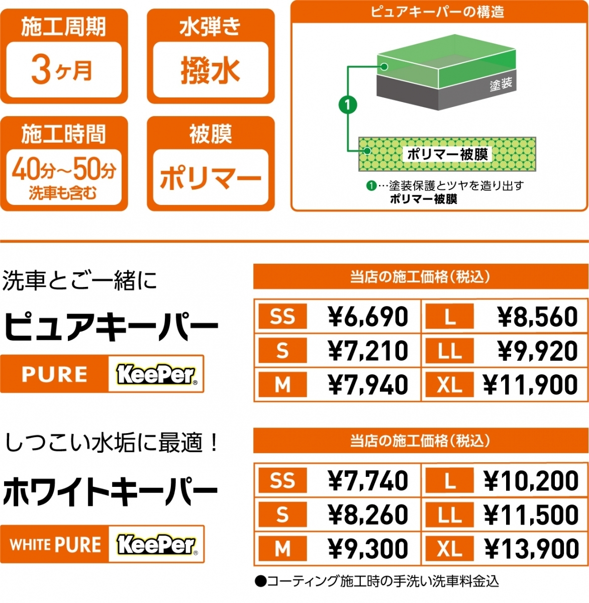 お客様のお車の使用状況やご希望に合った最適なメニューをご案内させていただきます。コーティングはもちろん、普段のお手入れについてや他社様のコーティングのメンテナンスなどでご不明な点があればお気軽にお申しつけ下さい!プロが責任を持ってお応えします♪ キーパー には「Wの透明皮膜」が存在し、雨粒を跳ね返し太陽で傷みにくくなる。これこそが真の醍醐味!!