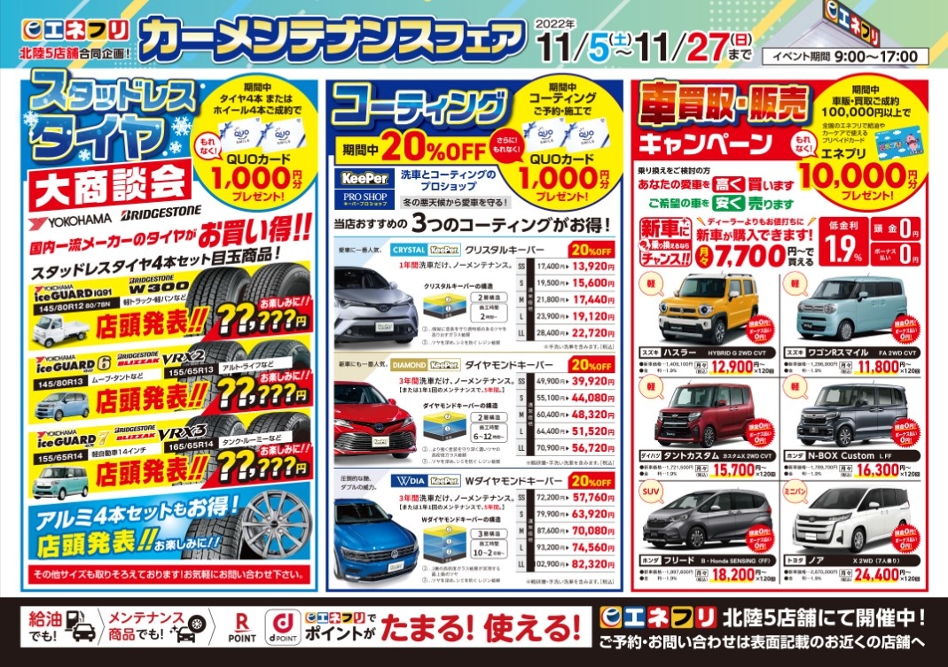 1台1台丁寧に仕上げます!気になる汚れ、コーティング等お車のことは、エネフリマキノ店にお任せください!!