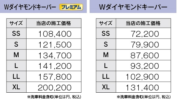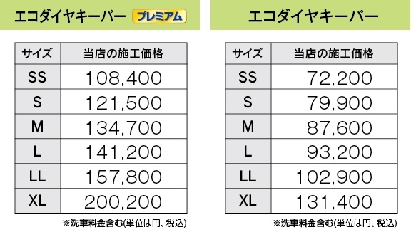 メニューの説明、価格はもちろん、車種別サイズ表も掲載されていて好評です。