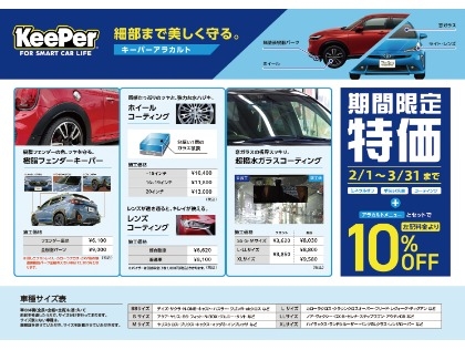 EXキーパーPREMIUM仕様 特徴 極上のEXキーパーに加えてあらゆる箇所を細部まで徹底的に綺麗にする究極のプラン ・超撥水ウィンドウコーティング(窓ガラス全面) ・ホイールコーティング2(ダブル) ・レンズコーティング(サイドバイザーもあれば施工) ・樹脂フェンダーキーパー ・ステップコーティング(ドア内側、ボンネット裏側、トランクの裏側、給油口の内側) ・エンジンルーム ・車内清掃 ※全キーパーコーティングシリーズの中でも最上級のコーティングプランです EXキーパーシリーズはWeb予約割の最大5%OFFしか適応できません。あらかじめご容赦ください。