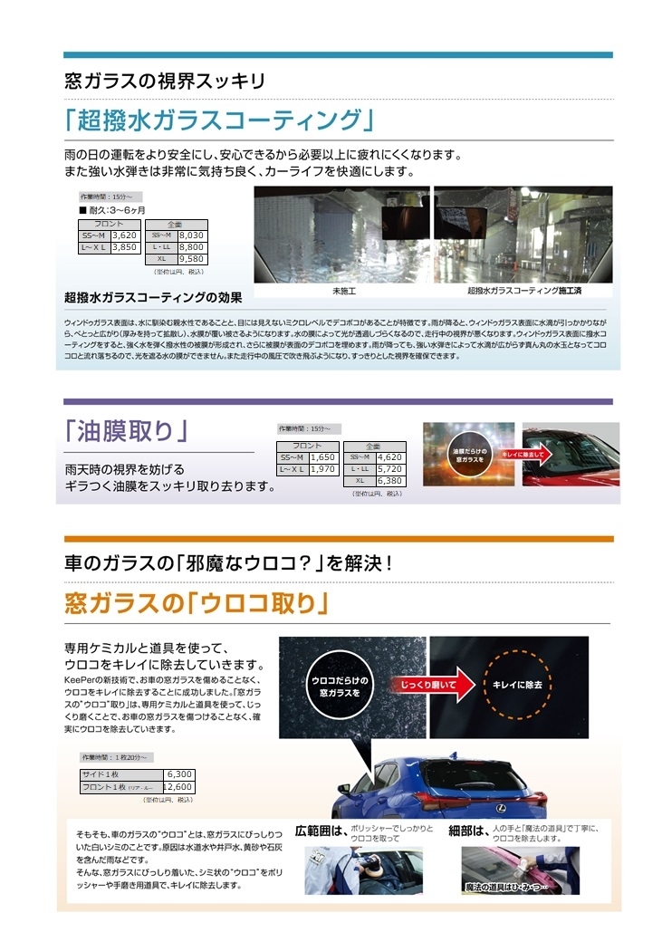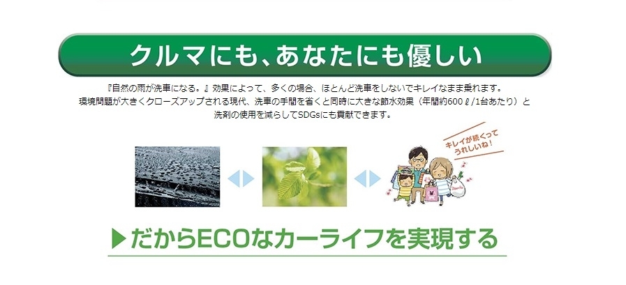 話題沸騰中!当店取り扱いしております。 ECOプラスダイヤモンドキーパー 「自然の雨が洗車になる」 その独特な防汚能力は特殊なコーティング表面の分子構造の効果で ホコリが降り積もっても塗装表面には密着せず、自然の雨が降れば その撥水力で弾かれた水と一緒にホコリなどの汚れも流れ落ちて しまいます。 汚れを落とす能力が長けている新ボディガラスコーティングです。
