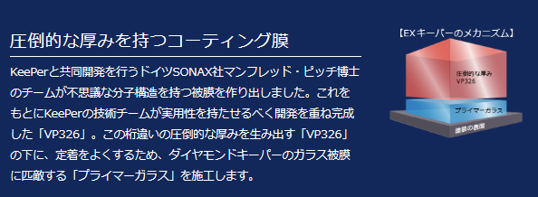 ・無機質であるガラスの被膜が強固にボディを守ります。ダイヤモンドキーパーのガラスは(クリスタルキーパーも)ドイツ最大のケミカルメーカーSONAXと共同開発。環境にも優しい、ボディガラスコーティングです。