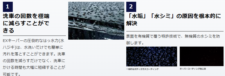 ・「ガラス被膜」がもつ、独特の「深いツヤ」と「発色」を「レジン被膜」がハイブリット効果で、より上質に強調します。ダイヤモンドキーパーの強い撥水角にレジンのすべりが加わり、真ん丸い水玉がコロコロとボディを滑り落ちます。