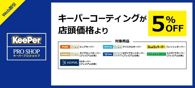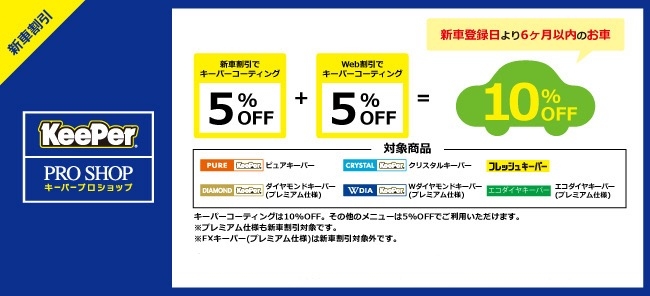 WEB予約なら5%OFFで承ります。さらに、新車登録6ヶ月以内の場合は、新車割引5%OFFです。(EXキーパーは新車割対象外です。)