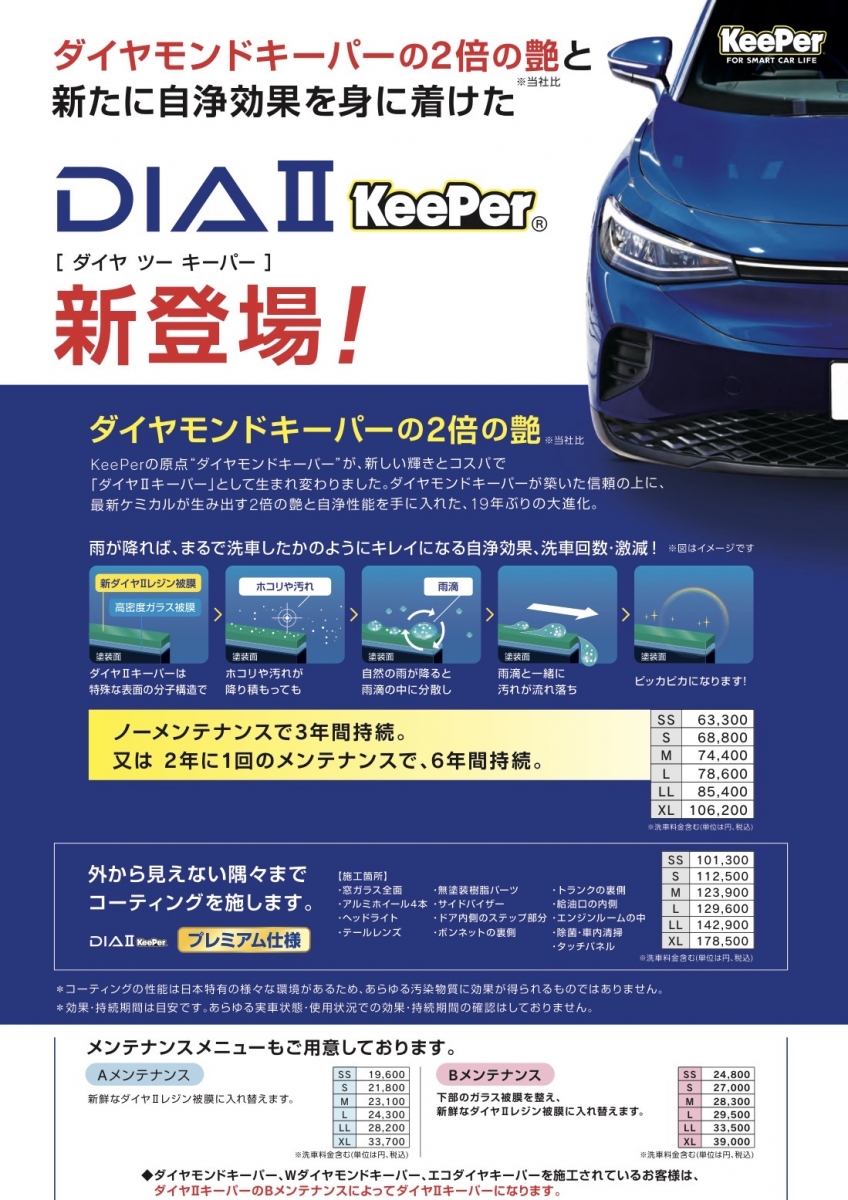 19年ぶりの大進化。ついに誕生した ― 新世代『ダイヤ2キーパー』全国のカーコーティングファンが待ち望んだ、19年ぶりのフルモデルチェンジ。『ダイヤキーパー進化バージョン』『ダイヤ2キーパー』 がつい...
