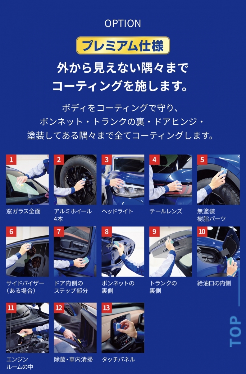 コーティングは【施工後がゴールでは無く施工後がスタート】だと考えております。 費用を出して頂いたコーティングもその後何もお手入れをしなければコーティング膜の上に汚れが溜まり、撥水が効かなくなったり艶が無くなったりします。 お手入れ不足が原因でコーティングの寿命も著しく縮めてしまう可能性も御座います。 でもご安心下さい。その状態にならない様に施工担当者はコーティングの耐久性期間中はキチンとアドバイスを行わせて頂きます。 その為に最低は3ヶ月に一度はお車の状態を見せにご来店頂ければ幸いです。 施工後はコーティングを証明する施工証明書を発行致します。