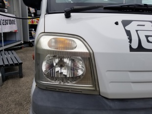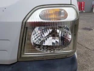 右側ヘッドライト、こちらは未施工です。黄色く変色し、曇っています。
