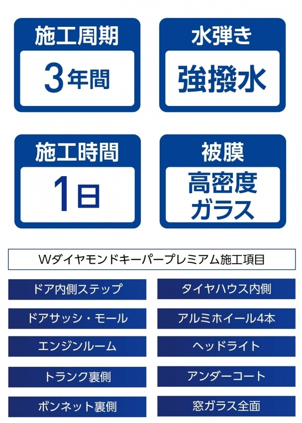 ボディを3層構造のWダイヤモンドキーパープレミアムで守り、ボンネット、トランクの裏、ドアヒンジ、塗装してある部分を全てコーティングします。