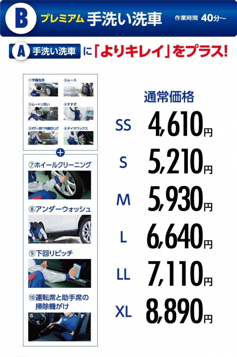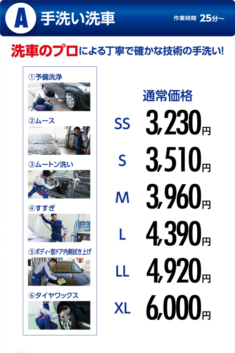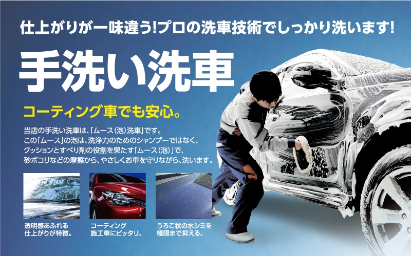 細かな部分までキレイになる「手洗い洗車」は、3コースあり!サクッと洗えるコースから、とことんこだわりぬいたコースまで、お好きにあったコースをお選びください。