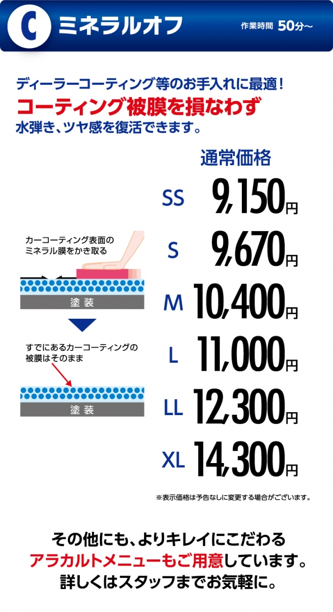 「手洗い洗車」や「キーパーコーティング」以外にも、豊富なオプションメニューを取り揃えています。ご希望のオプションがあれば、ぜひご利用ください。