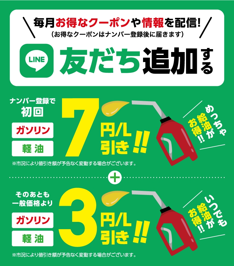 ガソリン・軽油が7円/L引き ※法人カードでは割引が適用されません