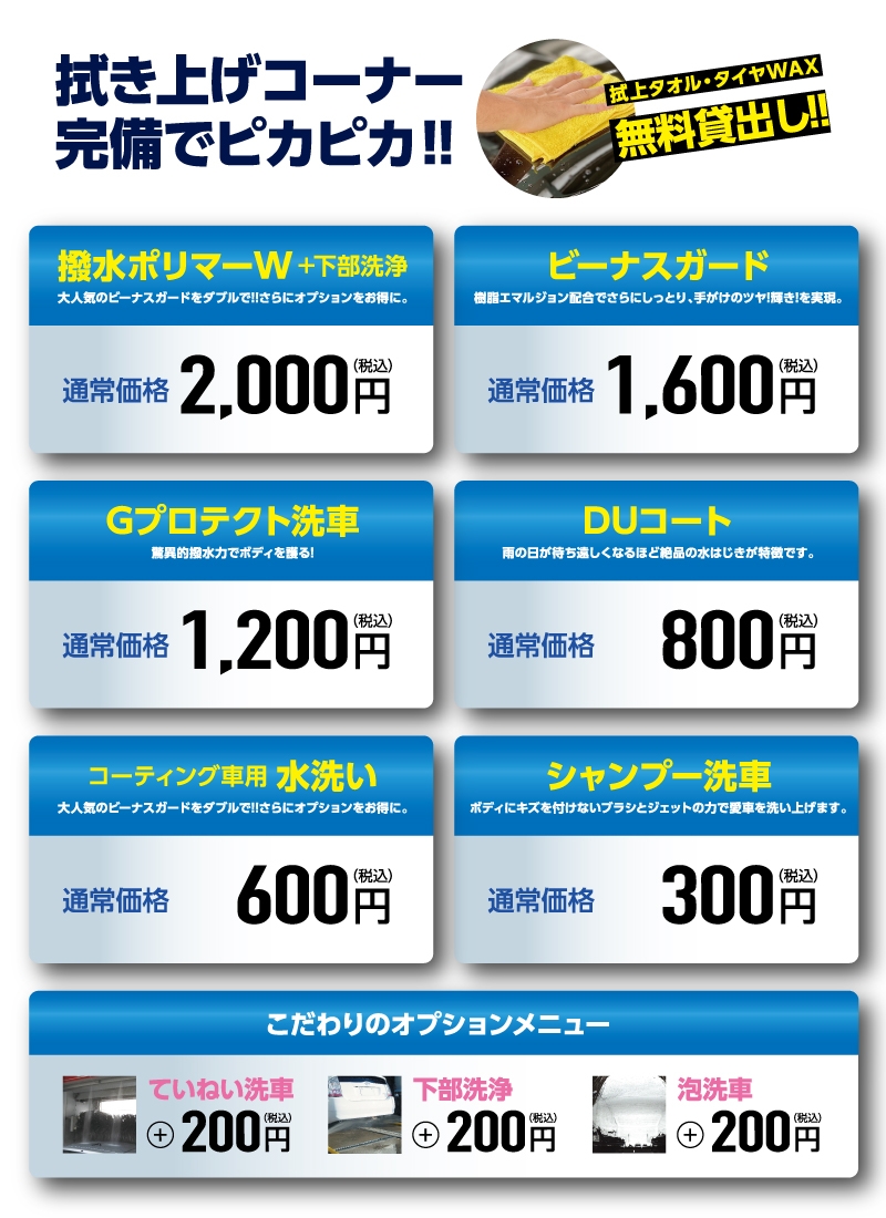 当店自慢の「ドライブスルー洗車」は、スピーディーかつキレイに仕上がります。コースは全部で6種類!拭き上げコーナーも完備(タオル・タイヤWAX貸出無料)。出勤前に!旅行前に!気持ちの良いスタートをぜひ切ってください。