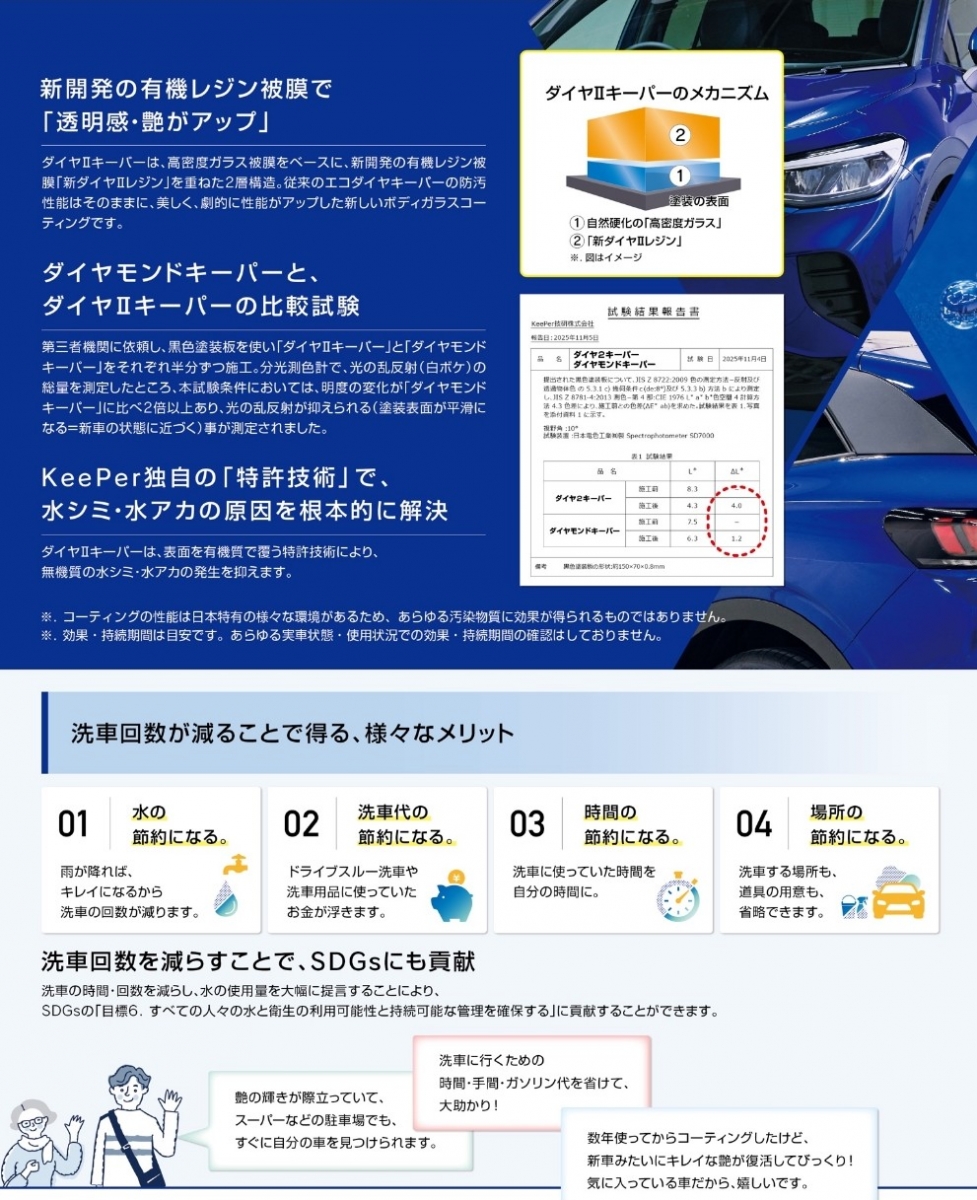従来のコーティングは、雨が降るとボディ汚れが気になります。しかし「EXキーパー」は圧倒的な撥水力があり、ホコリなどの汚れも水とともにはじくため、通常の雨程度であれば、まるで洗車をしたかのように車がキレイになります。そのため、洗車回数が減り、時間や費用のコストを削減することができます。