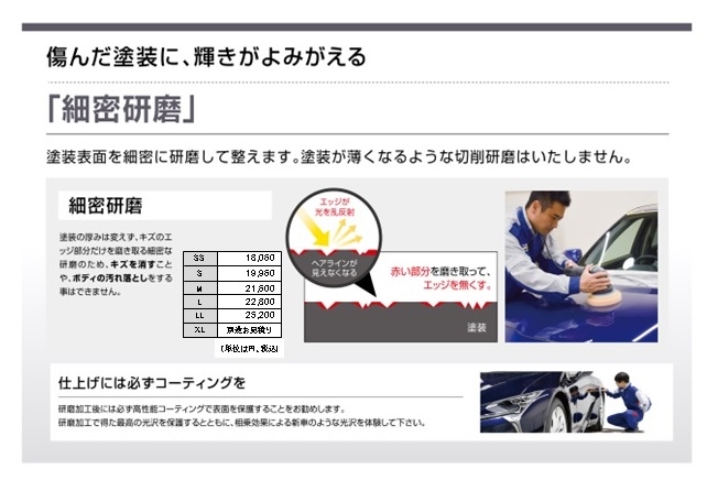 傷んだ塗装に、輝きがよみがえる。 キズのエッジ部分だけを磨き取る研磨。