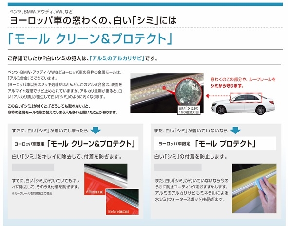 ヨーロッパ車の窓枠の金属モール(アルミ合金)に白い「シミ」が着くのを防ぎます。