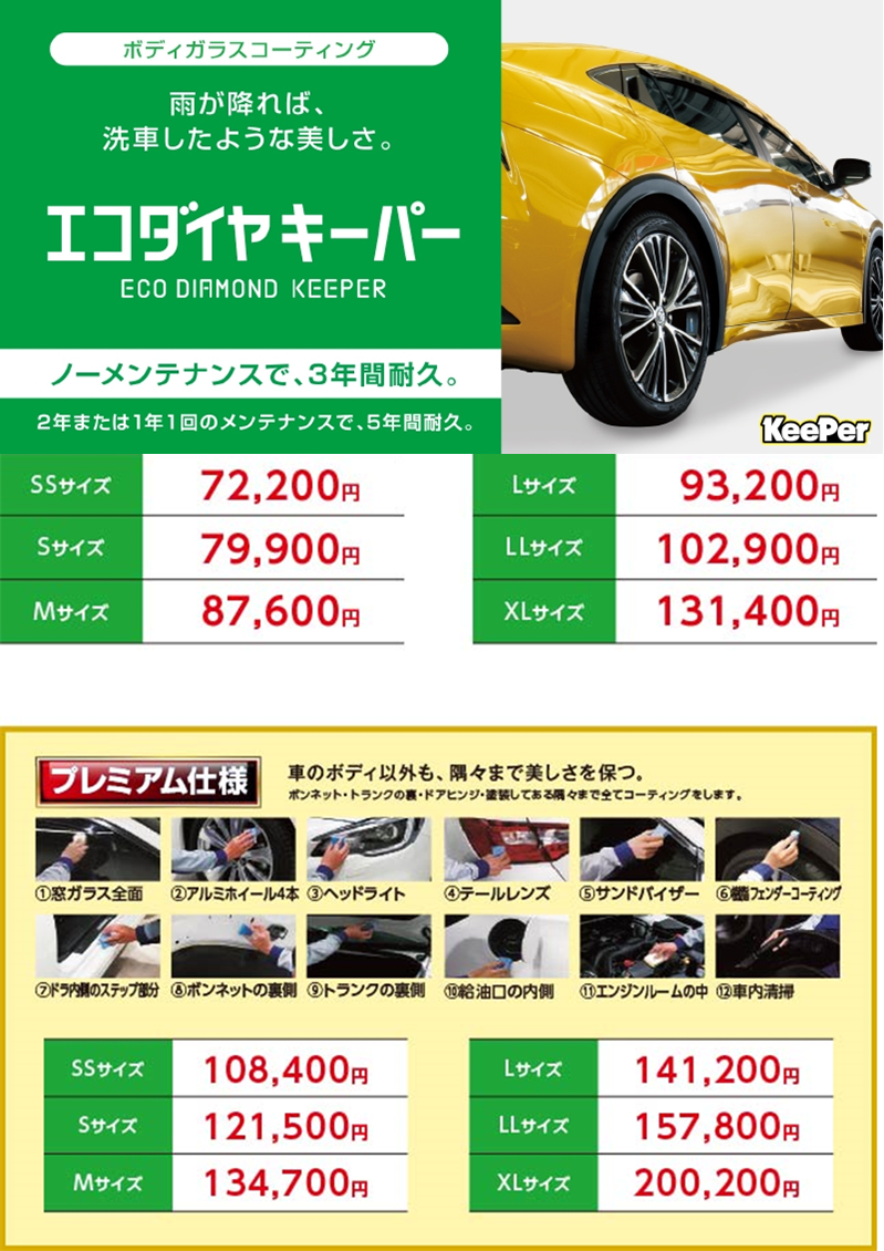大人気のコーティングメニュー!!その名はエコダイヤキーパー! 自然の雨が洗車になる!という事です。 実際に施工してみると、ボディはツルツルしておりまして その手触りから実感できる商品です! 当店でも既に取り扱いを始めております!! 実際にお試しの無料部分施工も行っておりますので お気軽にご来店ください。