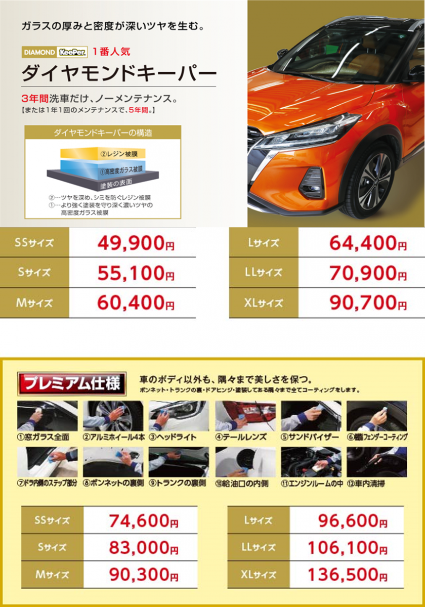 大人気のコーティングメニュー!!その名はエコダイヤキーパー! 自然の雨が洗車になる!という事です。 実際に施工してみると、ボディはツルツルしておりまして その手触りから実感できる商品です! 当店でも既に取り扱いを始めております!! 実際にお試しの無料部分施工も行っておりますので お気軽にご来店ください。