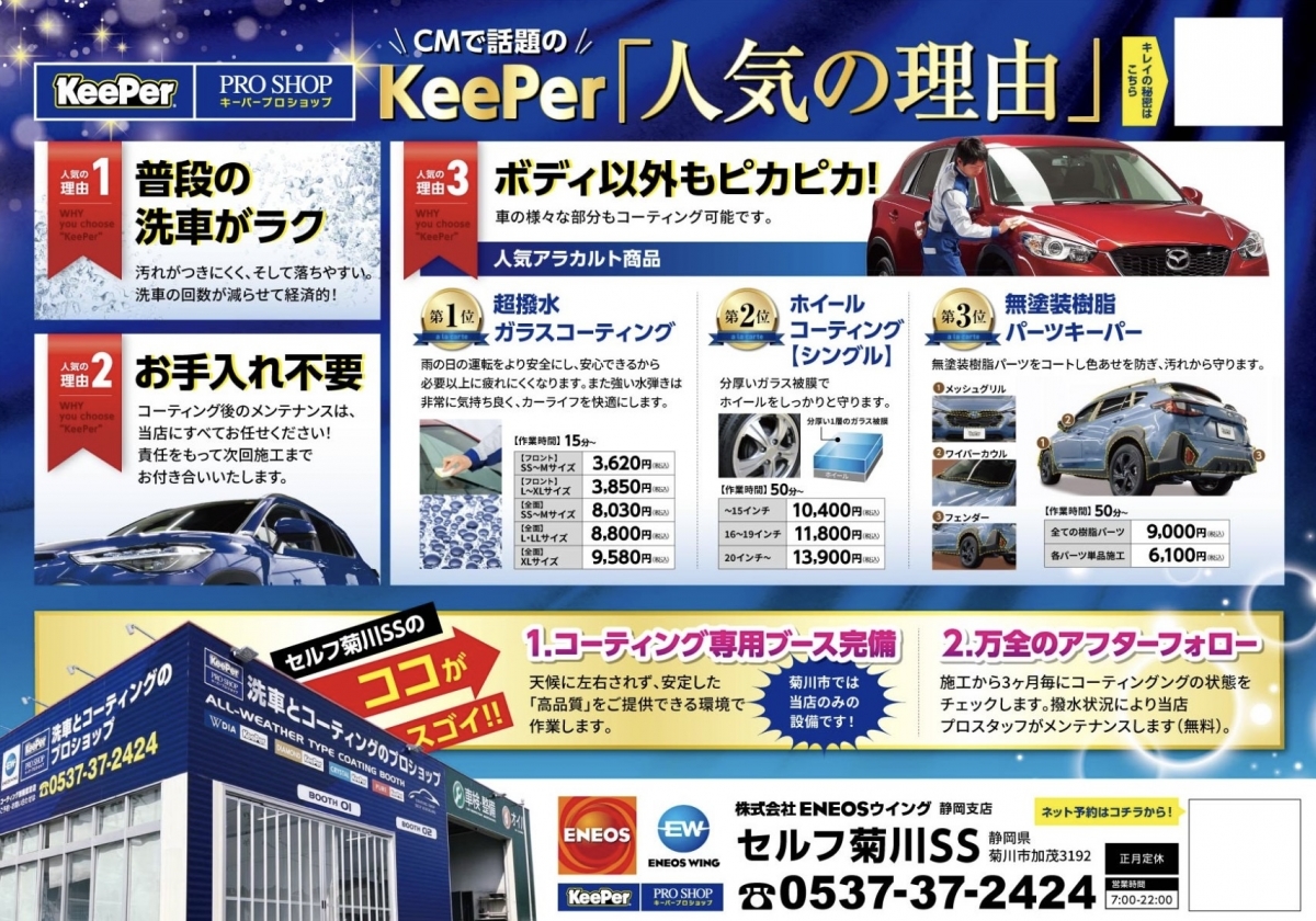 こんにちは、セルフ菊川SSのしょうじです!今日は冬らしい寒さが続く中、ガソリンスタンドでたくさんのお客様にご来店いただきました😊本日はコーティングのご依頼がなんと5台もあり、スタッフ一同やりがいを感じ...