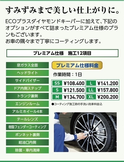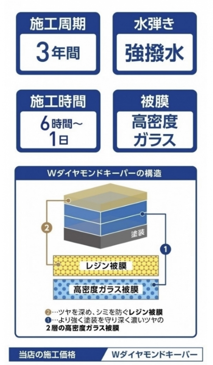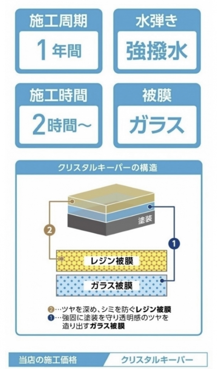 是非とも、一度ダイヤモンドキーパーまたはクリスタルキーパーを施工する事により、多層の汚れ、コーティング層をキレイさっぱり除去し、ガラス質の透明感あるツヤ、汚れにくいレジン被膜を乗せたキーパーコーティングをおすすめします。