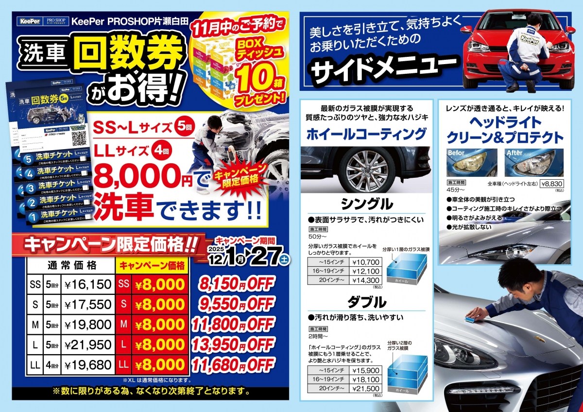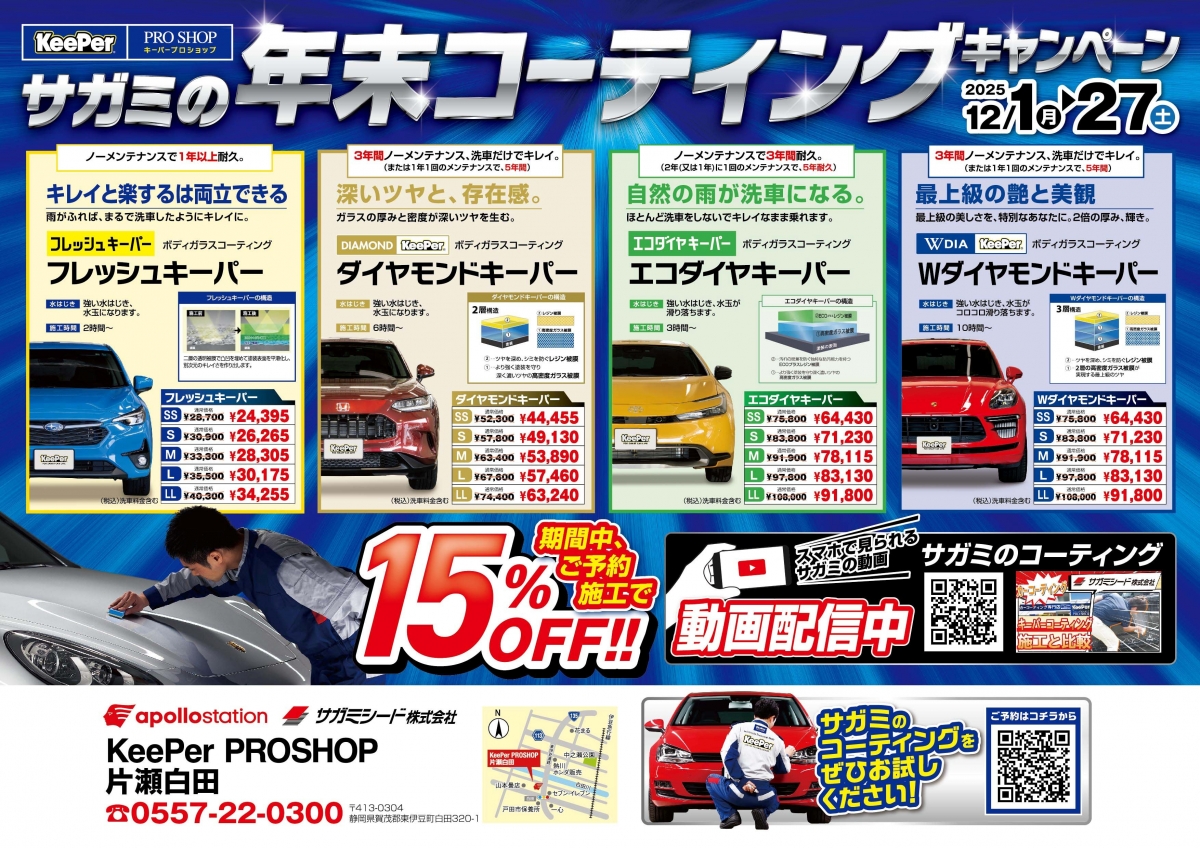 11月15日から12月27日までチラシ4種のコーティングを15%OFFにて施工できるチャンスです!!