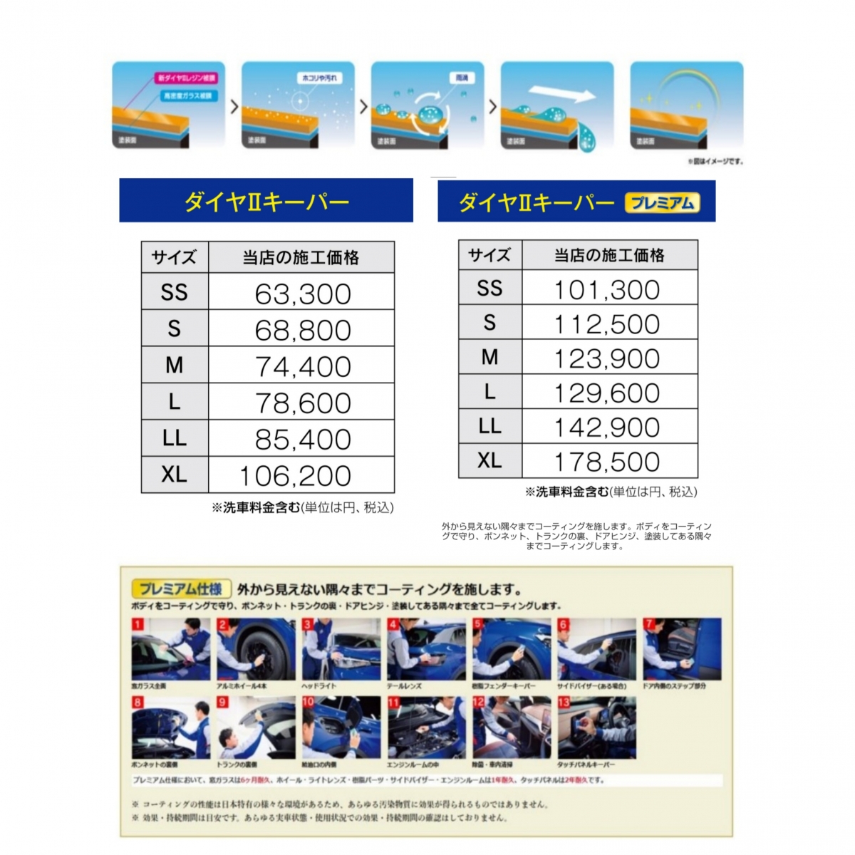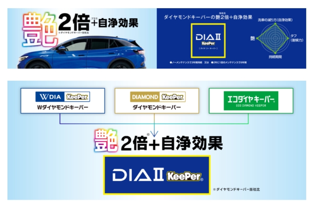 クリスタルキーパーのメンテナンス無しの1年間耐久の手軽さと艶感、そしてECOプラスダイヤモンドキーパーの雨が降れば洗車をしたように綺麗になる性能が加わった、キレイと楽を両立するコーティング。