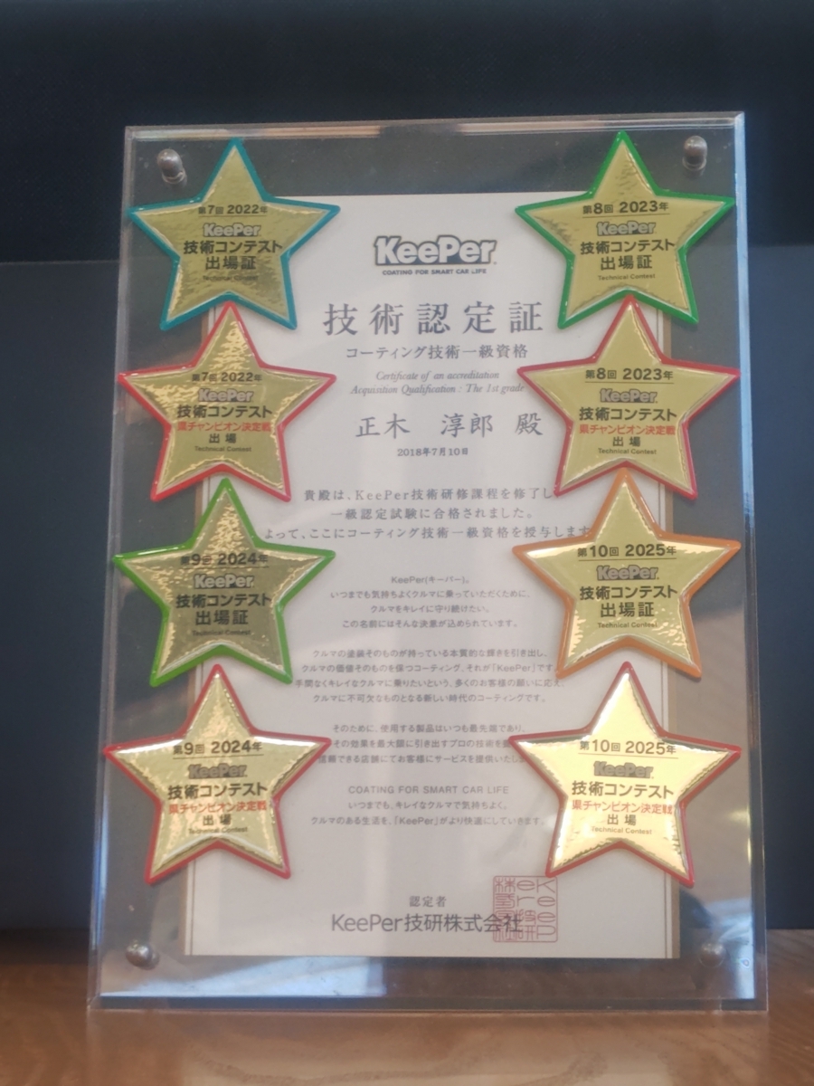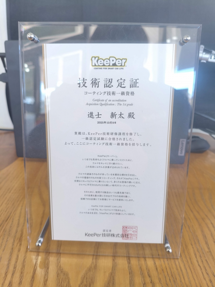 キーパーコーティングはたくさんのお客様からキレイになって良かった!との声を頂けるので、これからもお客様に喜んで頂けるコーティングを提供出来るよう日々精進して参ります。2級整備士の資格があり、オイルやタイヤなどのお困りの際は是非お待ちしております。