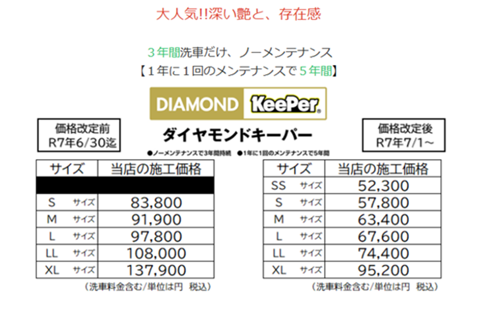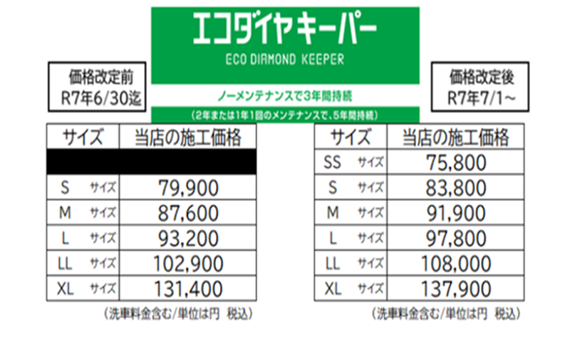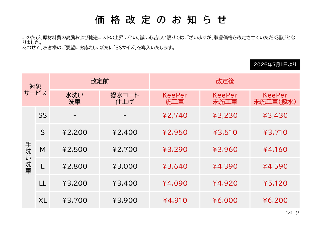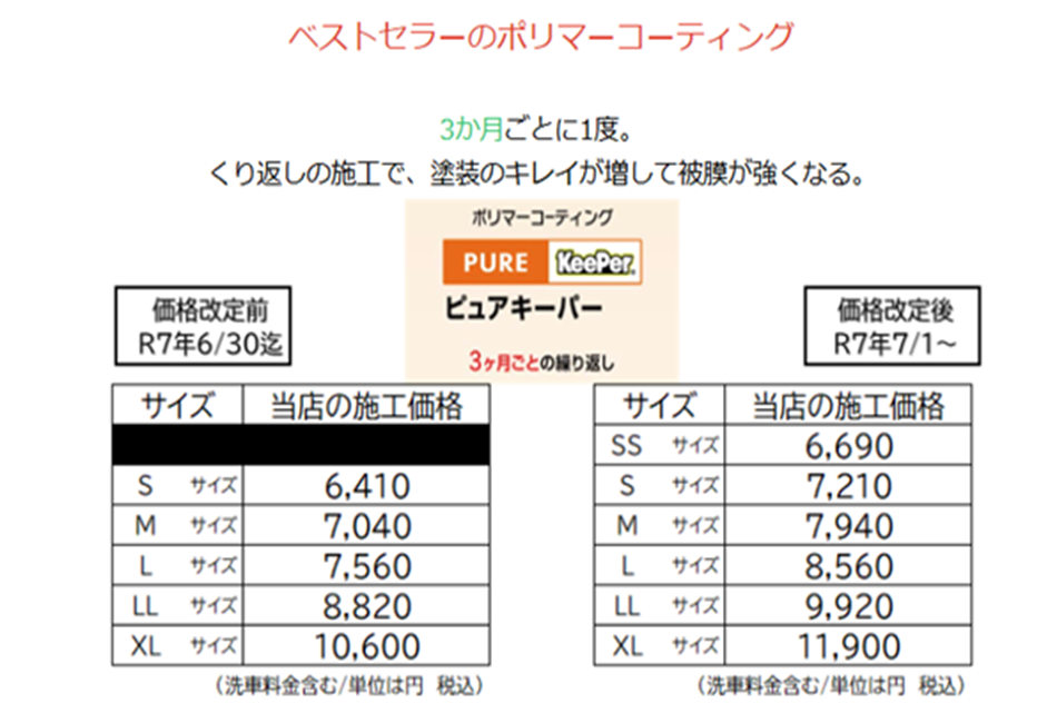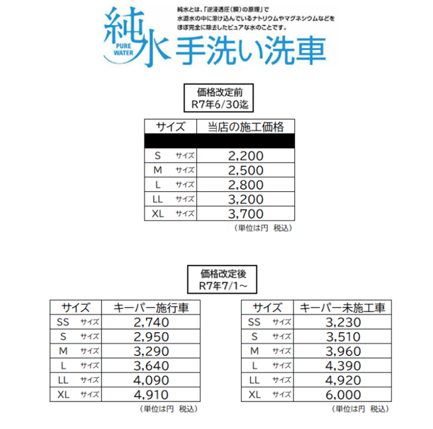 純水手洗い洗車・キーパーコーティング の価格を2025年7月1日より改定させていただく運びとなりました。