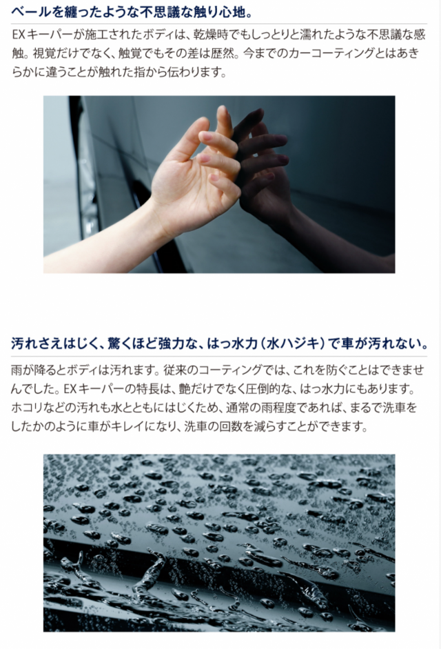 自然な雨が降れば元々持っている撥水力で雨と一緒に汚れが流れ落ち、まるで洗車をしたようにキレイになります。