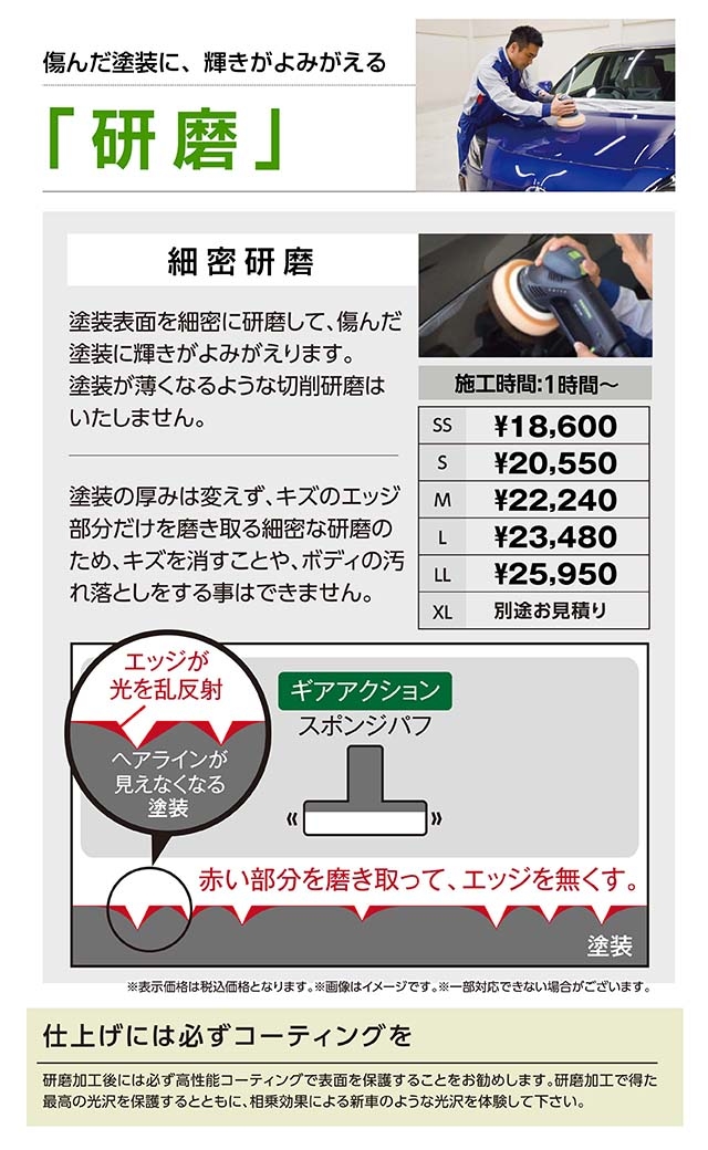 今回ご紹介したものは、小キズを取り、塗装面を滑らかにし、鏡のようなツヤを出す鏡面研磨ですが、他にもキズのエッジ部分だけを取りツヤを出す、軽研磨もメニューにございます。軽研磨+コーティングでも、仕上がりは普通にコーティングをしたものと比べると全く違います。特に年数の経過したお車には軽研磨、鏡面研磨はお勧めです。是非お試しください。
