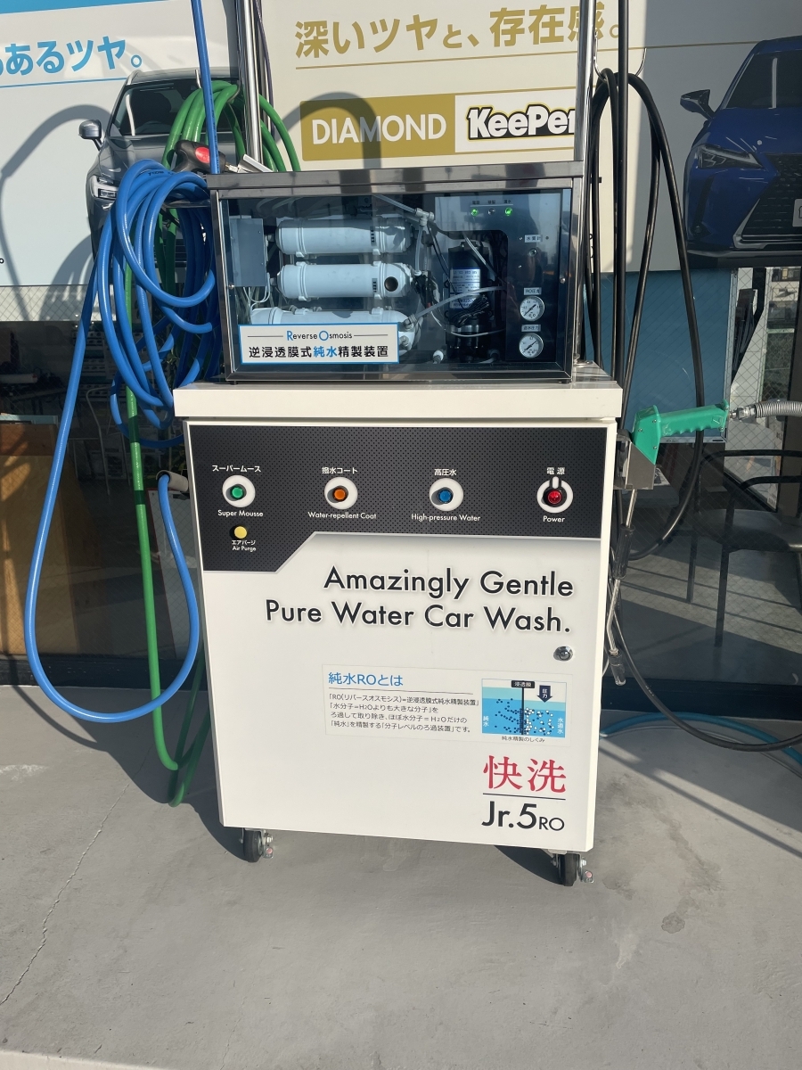 快洗jrという純水精製機を使い純水を精製します。純水とはウォータースポットの原因となるカルキ、ミネラル等の不純物を取り除いた水の事を言います。不純物を取り除いている為、洗車時の拭き残し等による水シミ等が出来ることがありません。