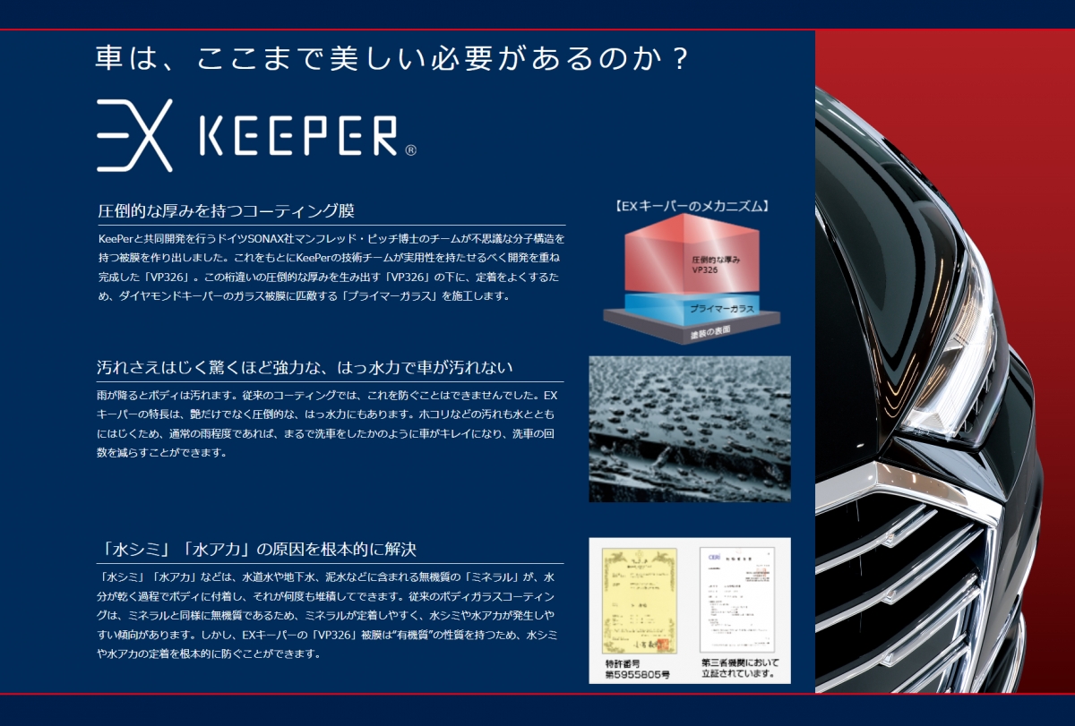 最上位グレードのEXキーパーは、塗装の上に透明なベールを纏ったような「過剰(EXCESS)」と呼ぶほどの圧倒的なツヤを作り出します。 車の塗装が本来持っている美しさを引き立てるだけでなく、 コーティング自体が存在感を持つ、車史上初めての美しさです。