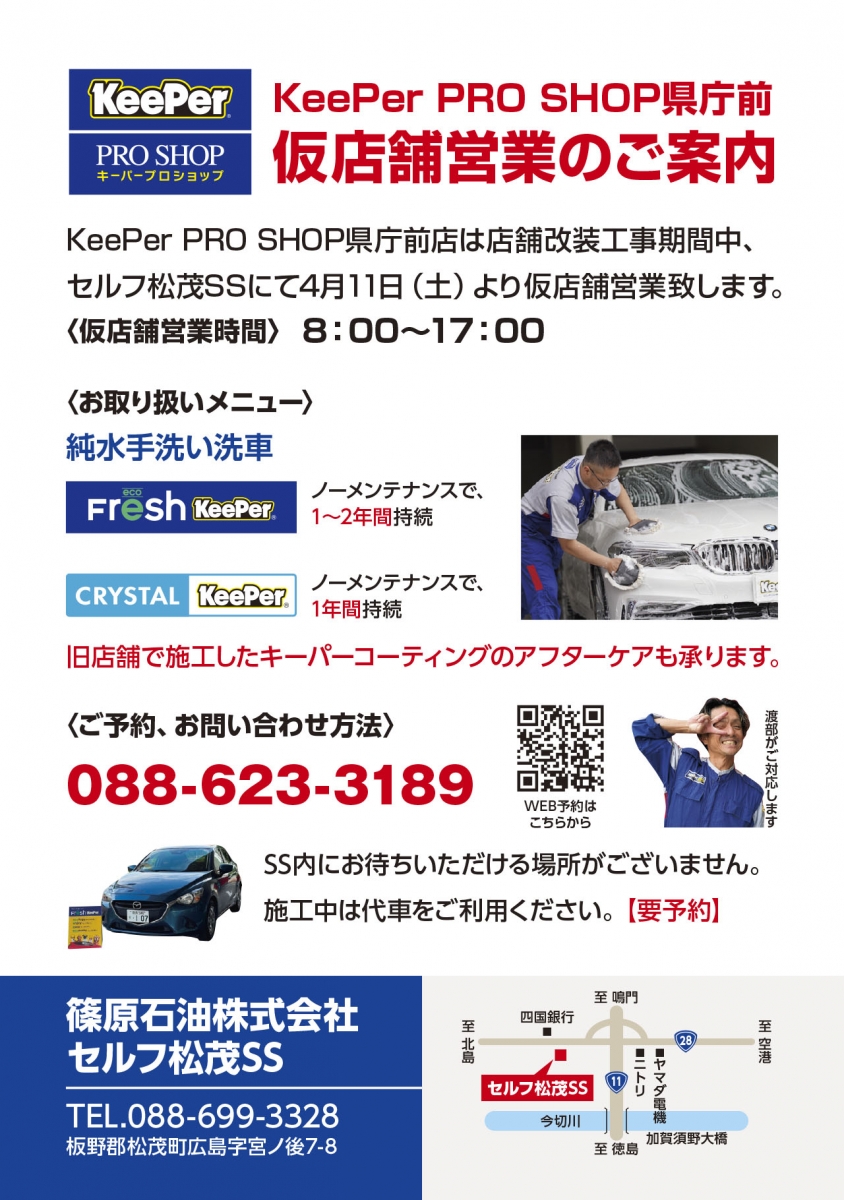 KeePer PRO SHOP セルフ松茂内 仮店舗営業のご案内