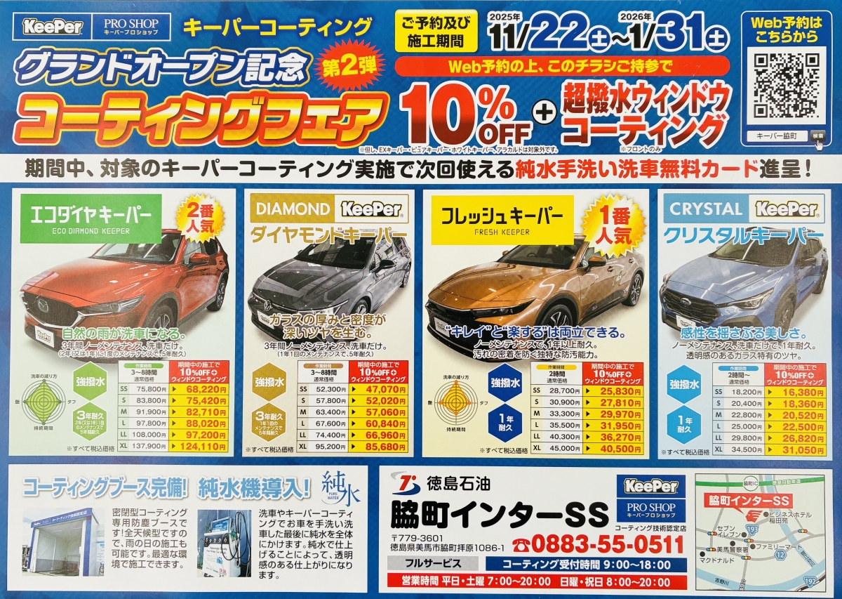 徳島石油(株)キーパープロショップ脇町店の上田です!当店ではR7 11月22日〜R8 1月31日までの期間中にグランドオープン記念第2弾コーティングフェアを実施しています!✨この期間中に対象のキーパー...