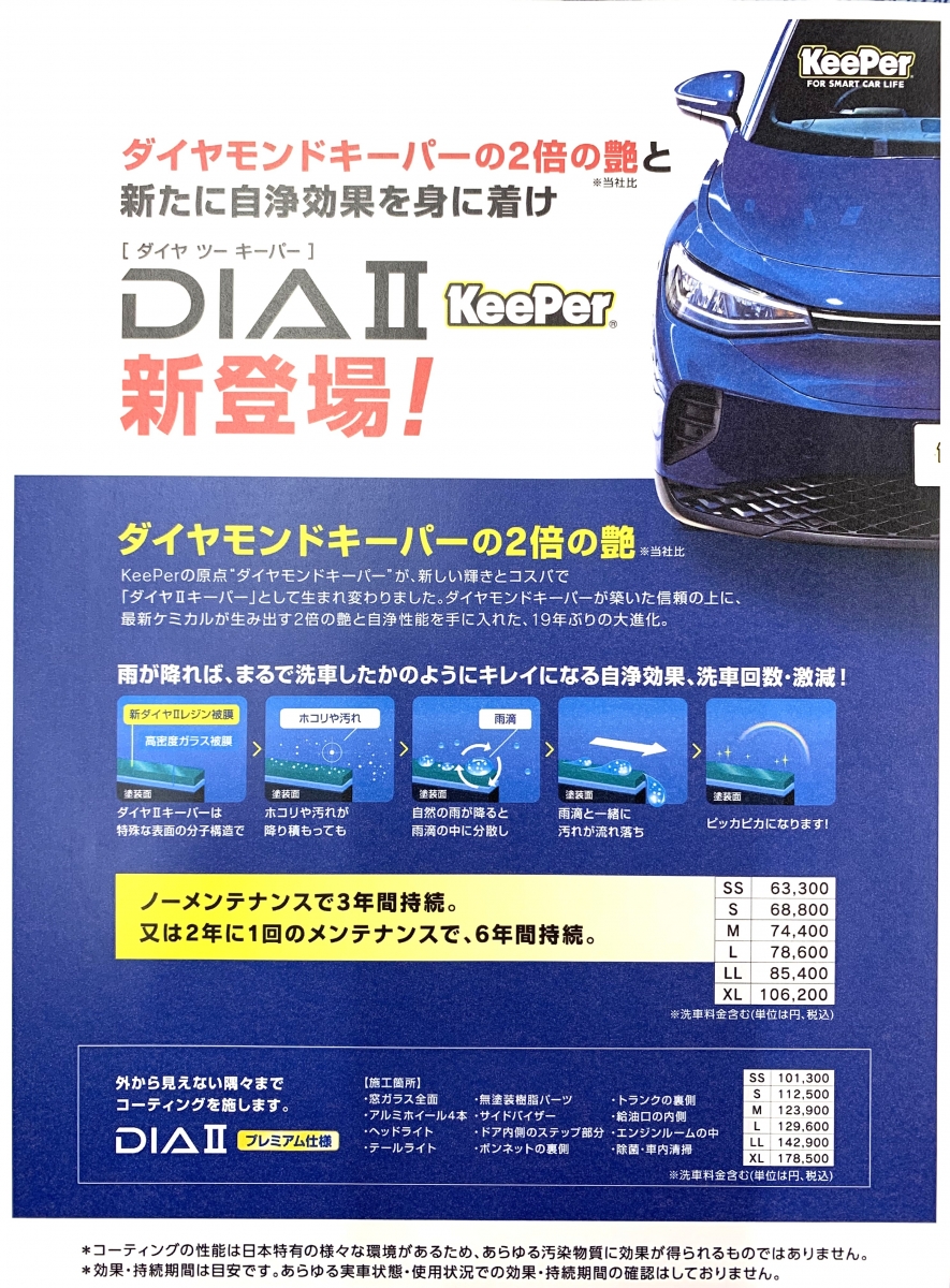 いつも当店のご利用ありがとうございます。ダイヤモンドキーパー/Bメンテナンスを施工させていただきました。ダイヤモンドのツヤ、水はじきが出てキレイに仕上がりました。また気になる所等いつでもお聞きください...