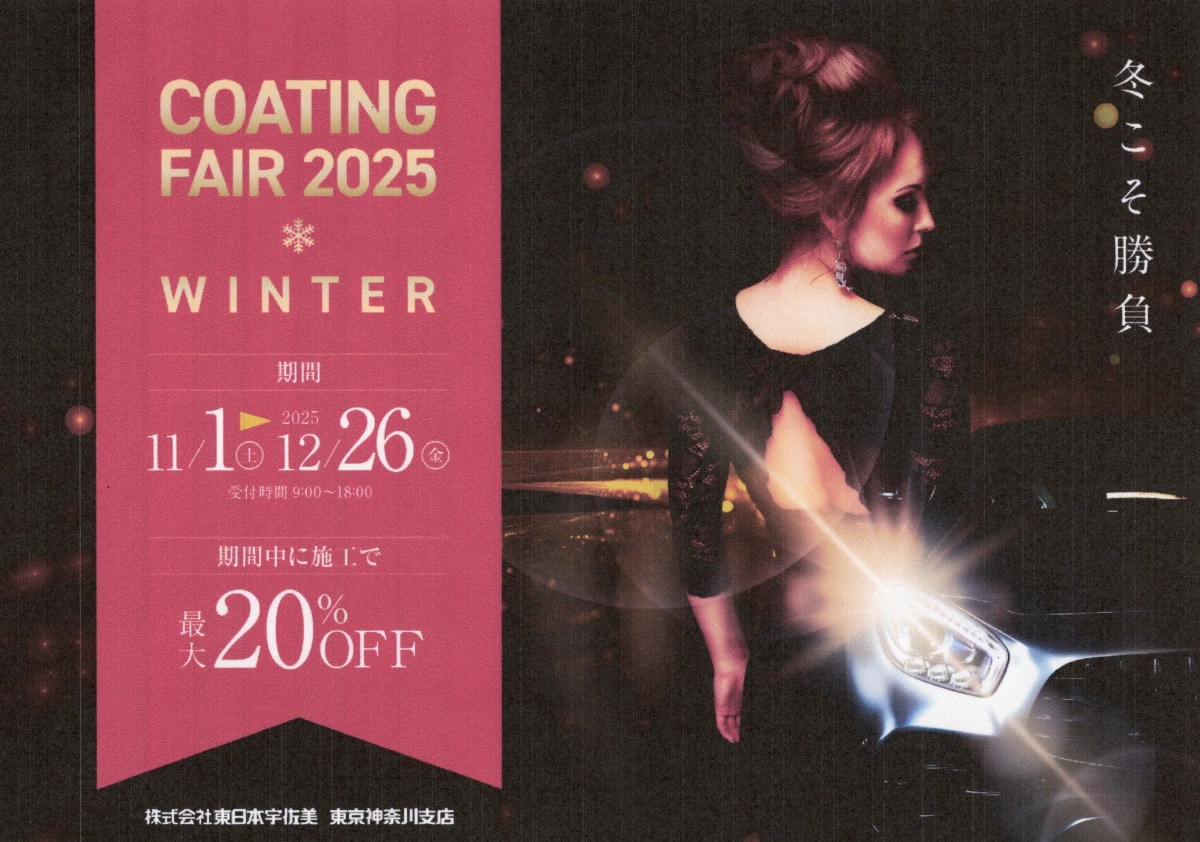 11/1~12/26までの期間、コーティングメニューを定価の10~20%OFFで施工できちゃいます!コーティングに興味のある方も再施工を検討中の方も今がチャンスです!豊富なオプションメニューも取り揃え、当店自慢のコーティングスタッフがお客様のお車をピカピカにしちゃいます👍