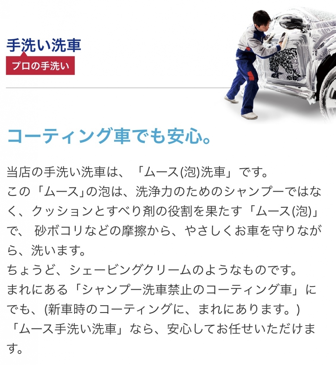 洗車からコーティングまで、プロが一台一台ていねいに施工し、初めての方でも安心してご利用いただけるよう、わかりやすいご案内を心がけています。